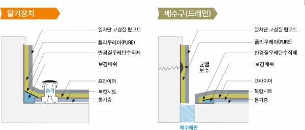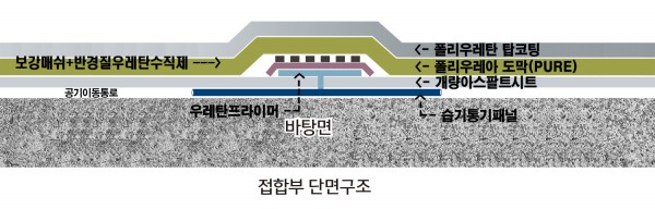 개량형복합시트+ 폴리우레탄방수도막 + 순수우레아접합(경도90이상) + 탑코팅으로 구성된 방수층은